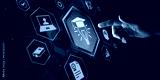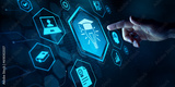 E-learning technology, webinar, online education and training to develop new skills and knowledge. AI-enhanced learning with personalized courses. Remote learning on internet. Virtual screen.