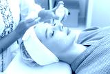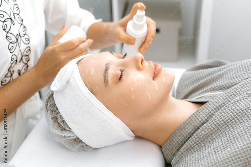Applying gel on the face of a caucasian beautiful woman for cleansing before facial skin care procedures, nutrition, moisturizing. Beauty concept. Skin care procedures