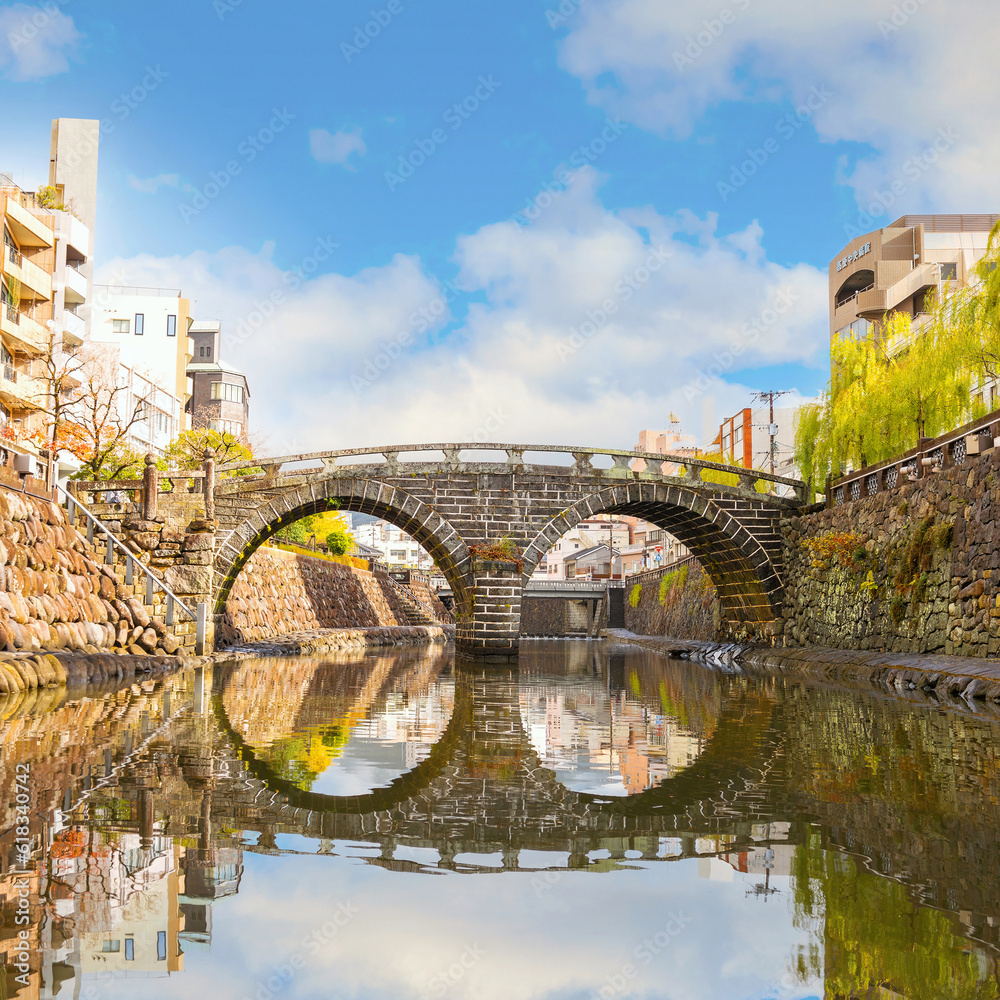 Nagasaki, Japan - Nov 29 2022: Meganebashi Bridge is the most remarkable of several stone bridges. The bridge gets its name from the resemblance of spectacles when reflected in the river water