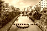 Nagasaki, Japan - Nov 29 2022: Meganebashi Bridge is the most remarkable of several stone bridges. The bridge gets its name from the resemblance of spectacles when reflected in the river water