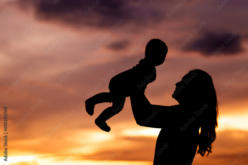 silhouette of mother holding and lifting with infant baby at sunset