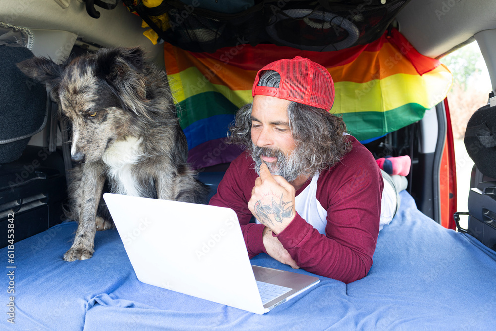 Middle-aged man lying in camper van using a laptop. Traveler with remote computer working online and enjoying vanity, freedom, resting in outdoor camp.