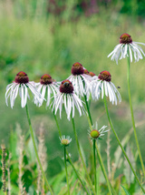 Echinaceae purpurea 'Alba' o Equinácea blanca. Hermosas flores con un centro marrón anaranjado rodeado de largas lígulas blancas sobre un tallo erguido y peludo con follaje verde oscuro