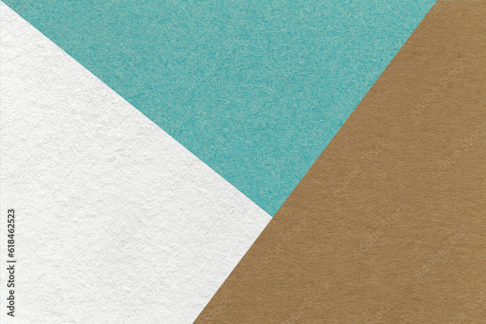 Texture of craft white, brown and turquoise shade color paper background, macro. Vintage abstract cyan cardboard