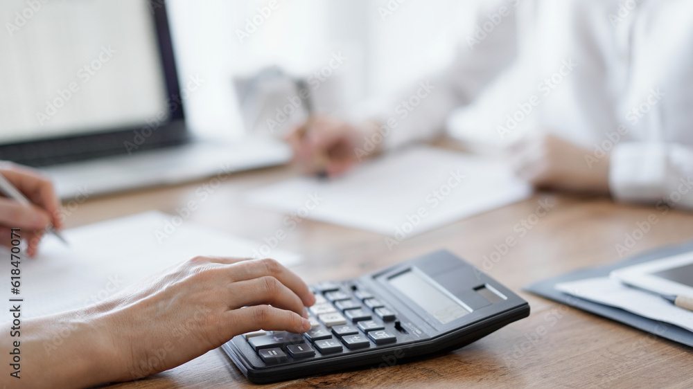 Two accountants using a laptop computer and calculator while counting taxes at wooden desk in office. Teamwork in business audit and finance