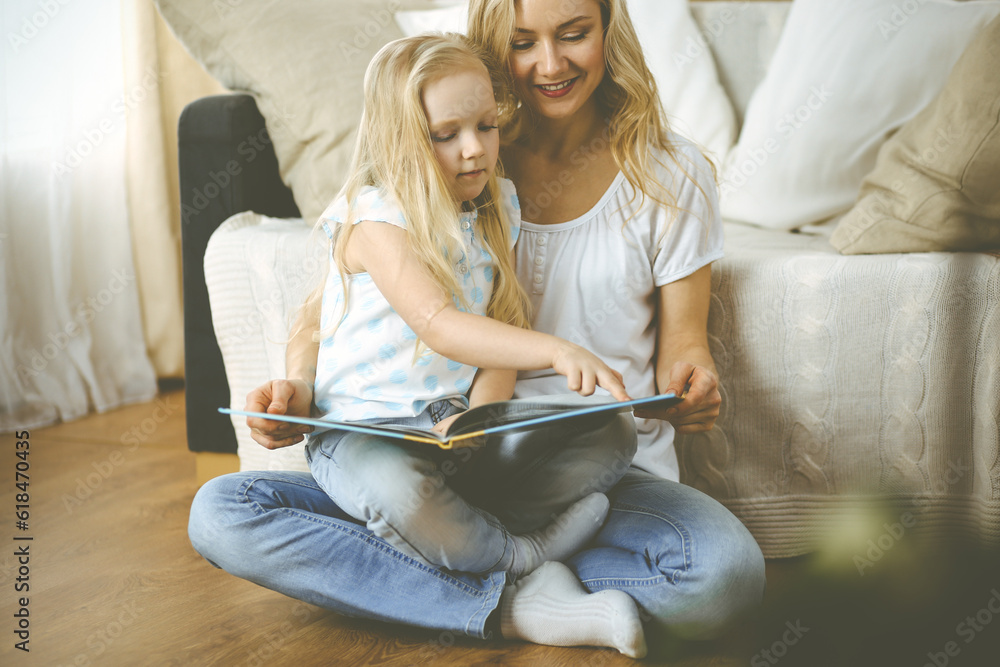 Happy family. Blonde young mother reading a book to her cute daughter while sitting at wooden floor. Motherhood concept