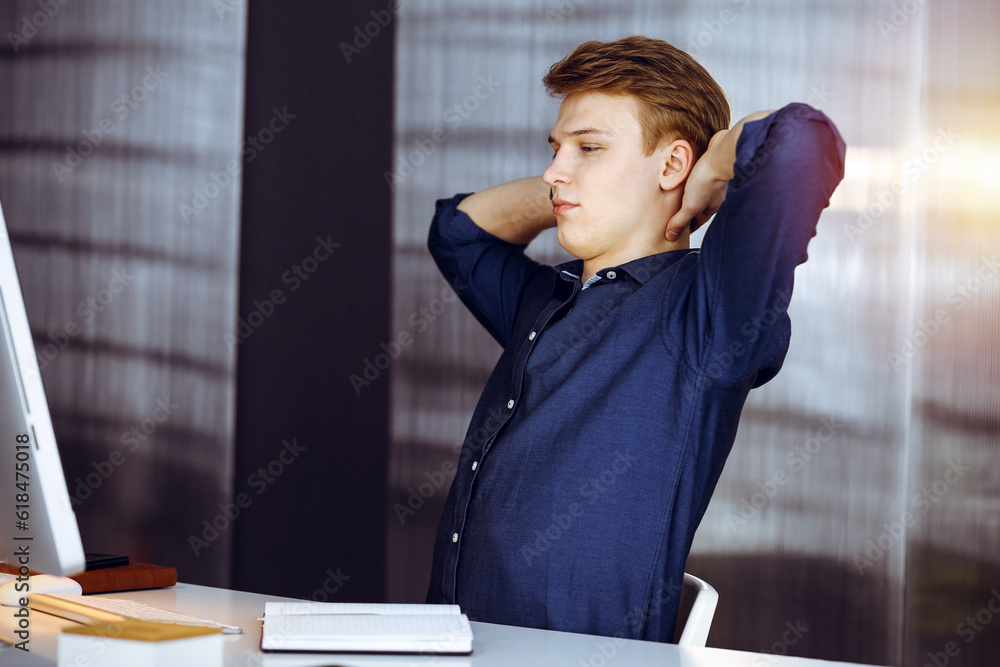 Young blond businessman and programmer stretching hands after working hard with computer in a darkened office, glare of light on the background