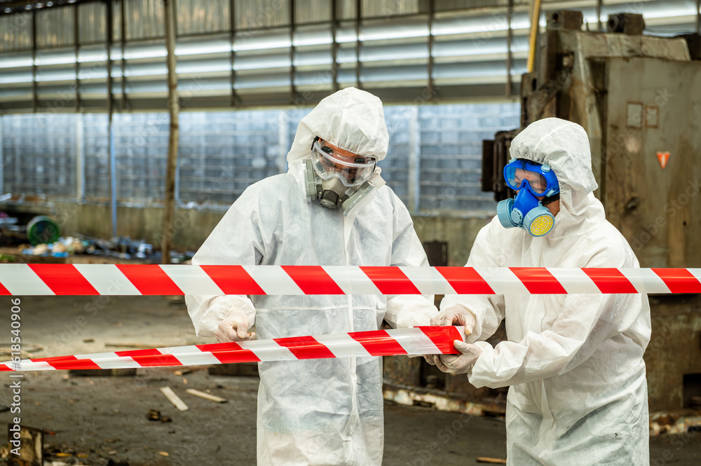 Man inspector scientist investigate chemical gas leak spill with safety face mask PPE suit in area closed barricade security red white tape. danger area infected toxic leak spill cross stripe ribbon