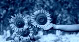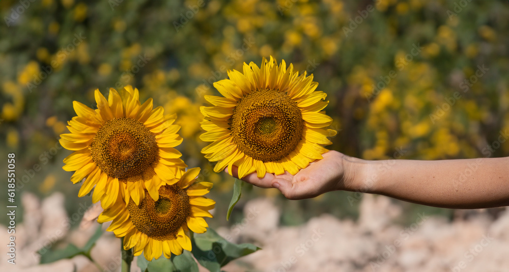Landscape Of Sunflower fields And blue Sky clouds Background.Sunflower fields landscapes on a bright sunny day with patterns formed in natural background..Landscape Of Sunflower fields And blue Sky
