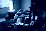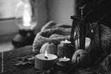 Cozy autumn composition with aromatic candle, pumpkins, wool sweater, leaves, cinnamon. Aromatherapy on a grey fall morning, home atmosphere of cosiness and relax. Wooden background close up.