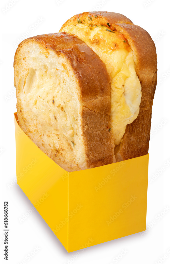 Egg Garlic Cheese Toast in paper bucket isolated on white background With clipping path.