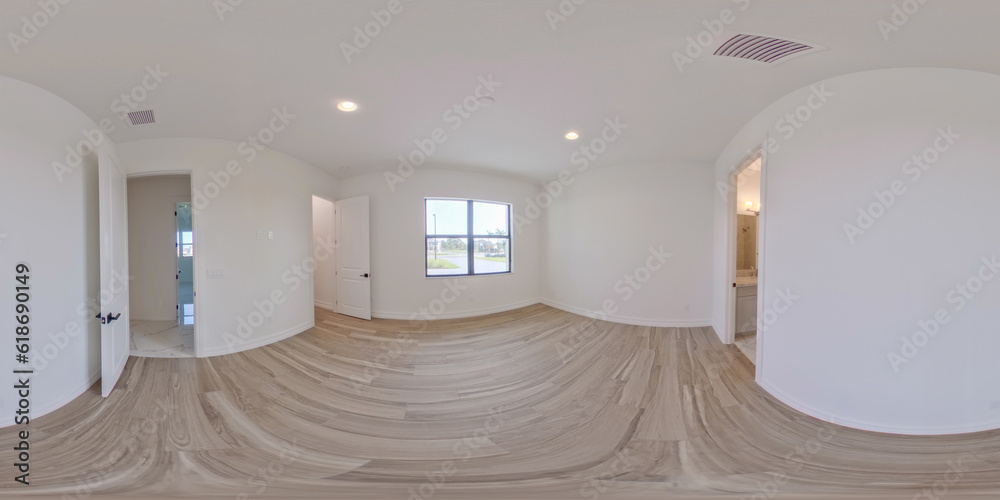 360 equirectangular Virtual tour bedroom photo with doors open and window view