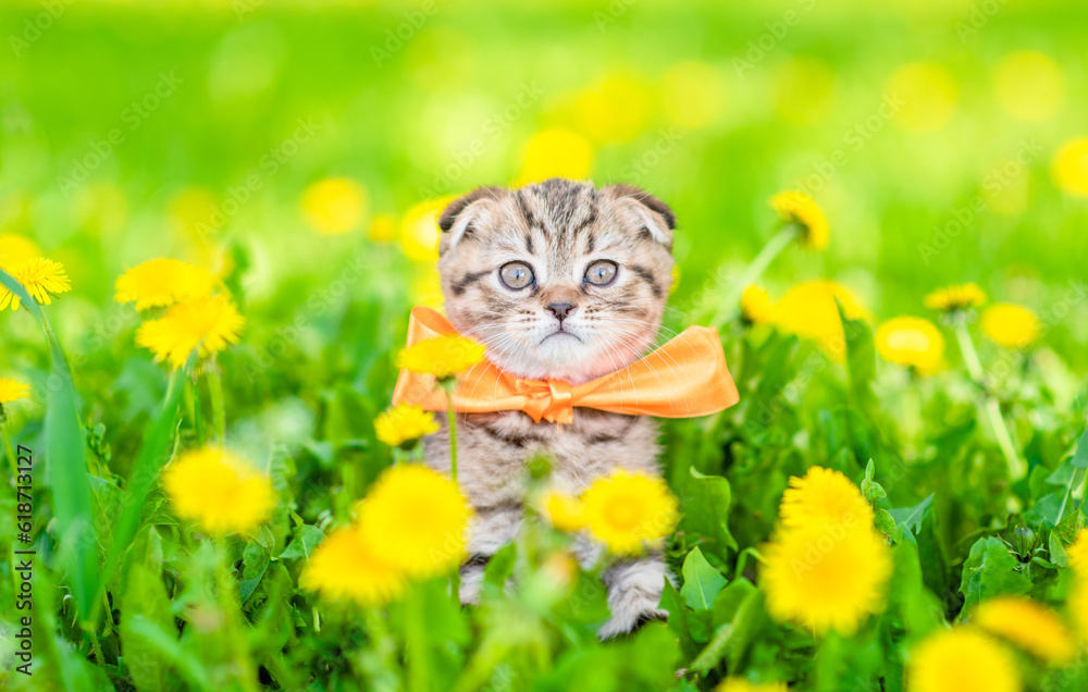 Tiny kitten wearing tie bow sits on dandelion lawn
