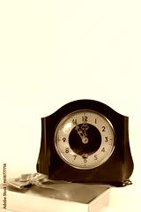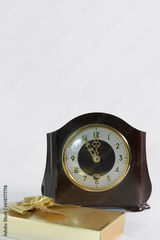 Table vintage clock and a gift in a golden package with a bow on a white background