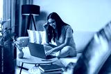 Back to study. Happy student doing her work at home on laptop in a cosy room