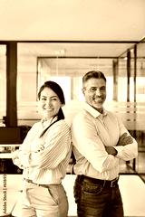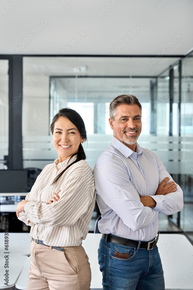 Happy confident professional mature Latin business man and Asian business woman corporate leaders managers standing in office, two diverse executives team posing arms crossed, vertical portrait.