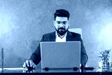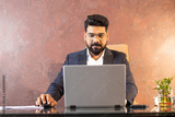Portrait of successful handsome indian businessman working on laptop computer in office.