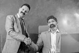 Two mature businesswoman or partners handshake after closing deal in corporate office.