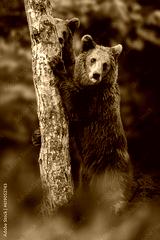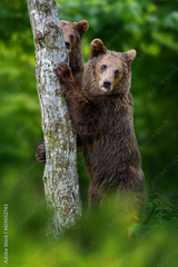 Two Brown bears (Ursus arctos) standing on his hind legs holding on to a tree