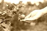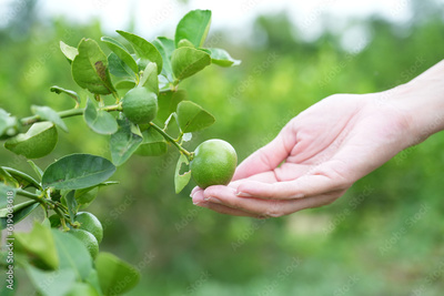 Hand holding fresh lemon from tree branch