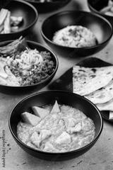 Braised chicken with tofu, Dan Dan noodles with minced pork, Naan flatbread and rice.