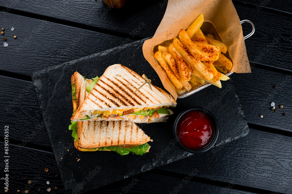 Sandwich with chicken, tomatoes, cheese, lettuce, French fries and ketchup, fresh fastfood.