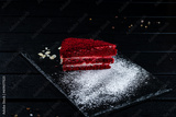 Piece of red velvet cake with almonds and powdered sugar on a dark background.