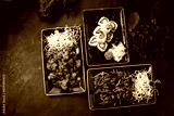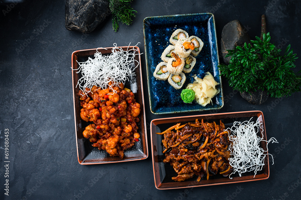 Sushi roll set with salmon, avocado, Philadelphia cheese, cucumber, pork and chicken with vegetables and sauce.