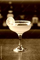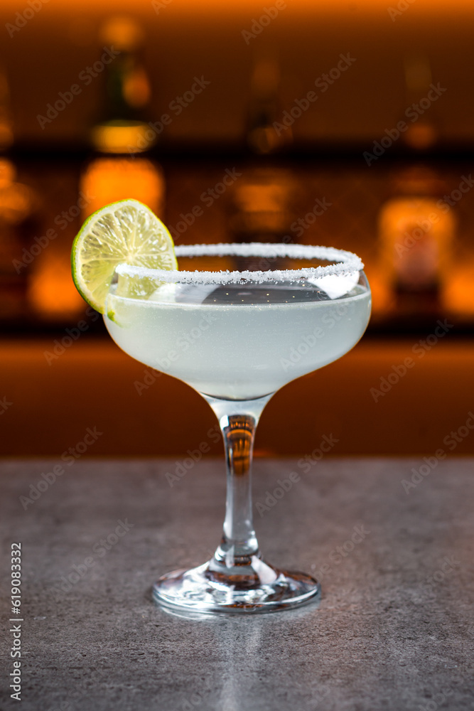 Margarita cocktail with tequila, lime, sugar syrup, salt and ice on the bar counter.