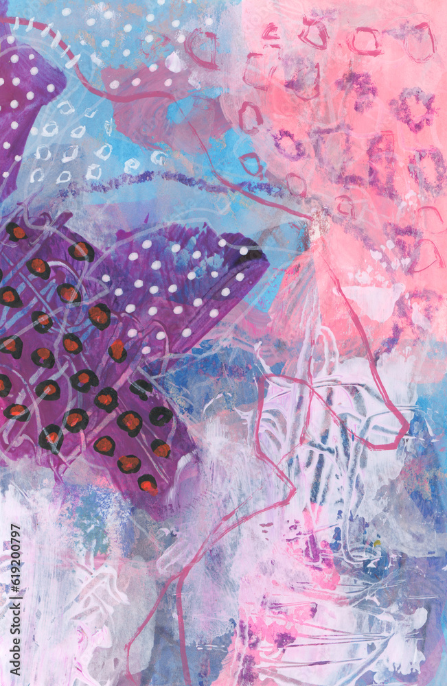 Art oil and acrylic smear blot dot canvas painting with pencil, pastel line elements. Abstract color stain brushstroke texture background.