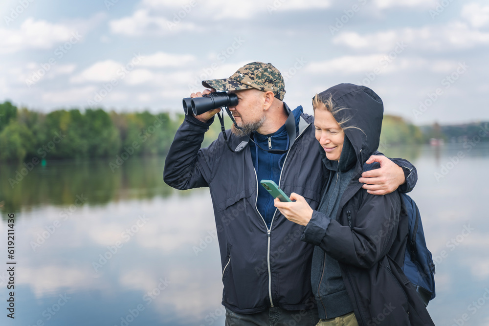 Middle-aged caucasian couple of travelers looking through binoculars while walking on the river bank and using smartphone
