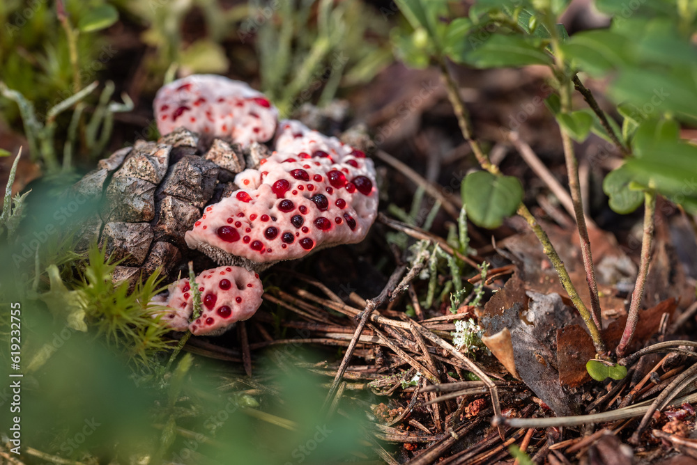 Inedible Hydnellum peckii fungus with funnel-shaped cap with a white edge and bright red guttation droplets, common names: strawberries and cream, bleeding Hydnellum, Devil's tooth.