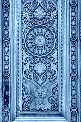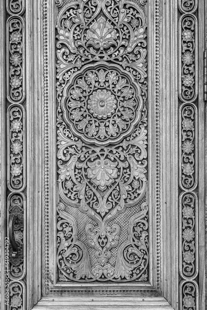 Black and white fragment of an ancient carved wooden door. Ornate.