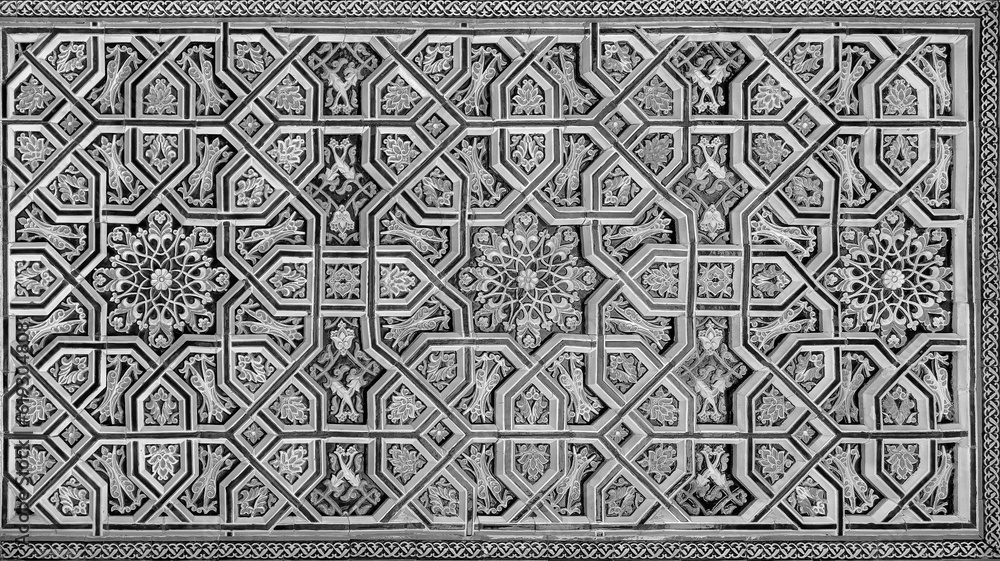 Geometric traditional Islamic ornament. Fragment of a ceramic mosaic. Black and white.