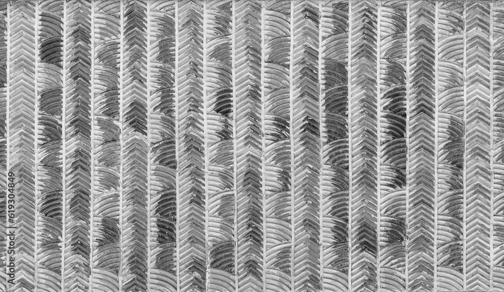 Decorative concrete wall with carved ornaments on it. Abstract background. Black and white.