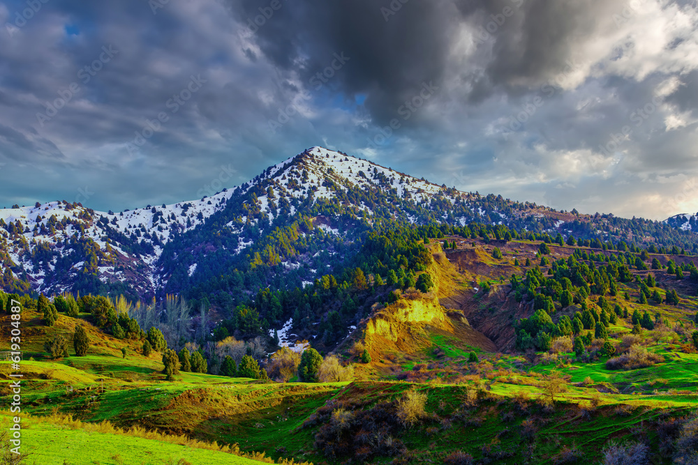 Mountain top covered with young snow and illuminated by the sun on a sunny day. Mountain landscape.