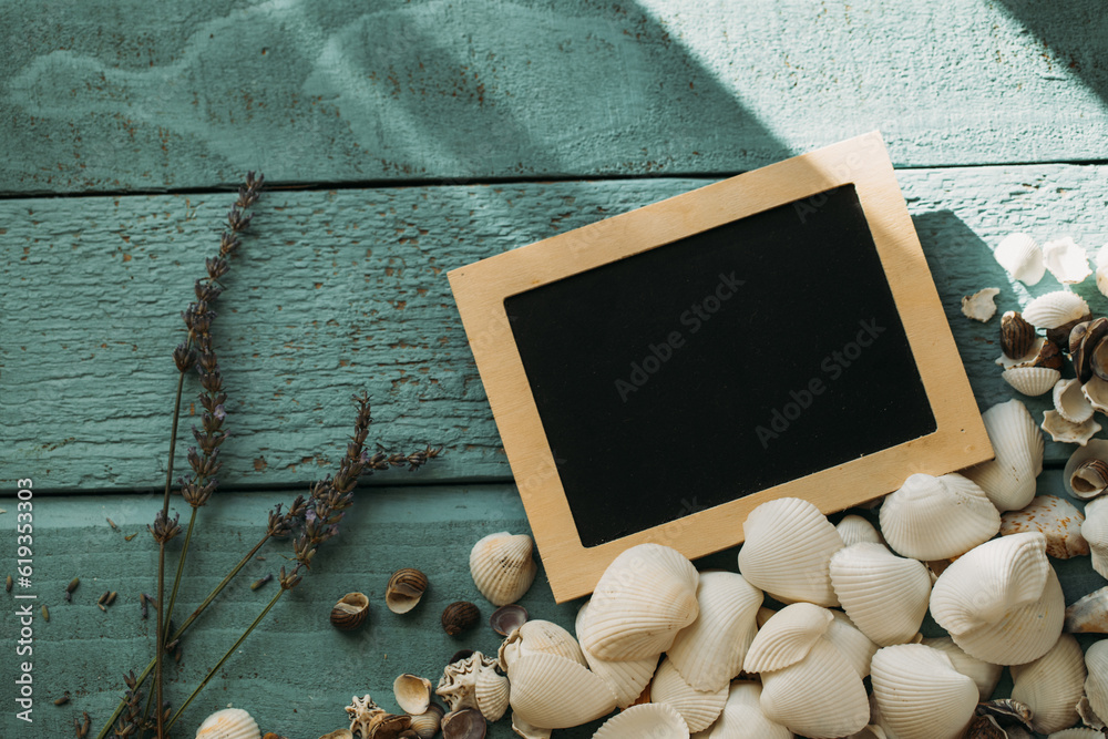Summer day, shells on the beach. Summer time. Vacation. Wooden table. Holiday