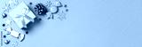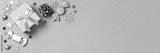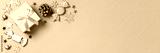 Christmas web banner with golden gift box with mini Christmas trees and shiny baubles on pastel pink background, Christmas border, copy space. Christmas gift idea, holiday presents concept