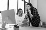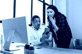 african american man sitting at table with caucasian woman and looking surprised at smartphone