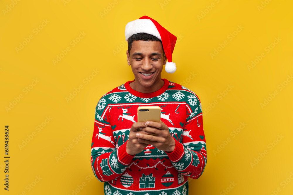 african american guy in christmas clothes and santa hat is using smartphone and smiling on yellow background