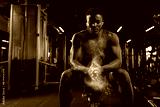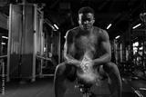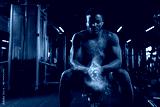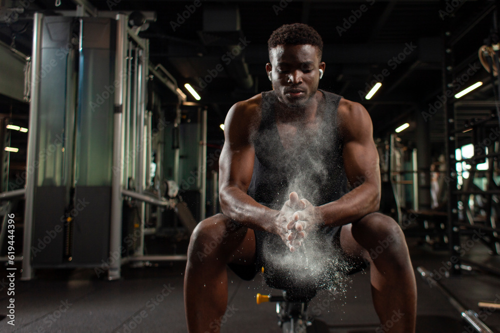 sporty african american man trains in dark gym and rubs his hands with magnesia, young guy makes clap