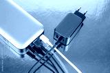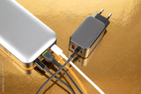 Power bank and charging plug with cable on a golden background. Electronic devices for charging gadgets