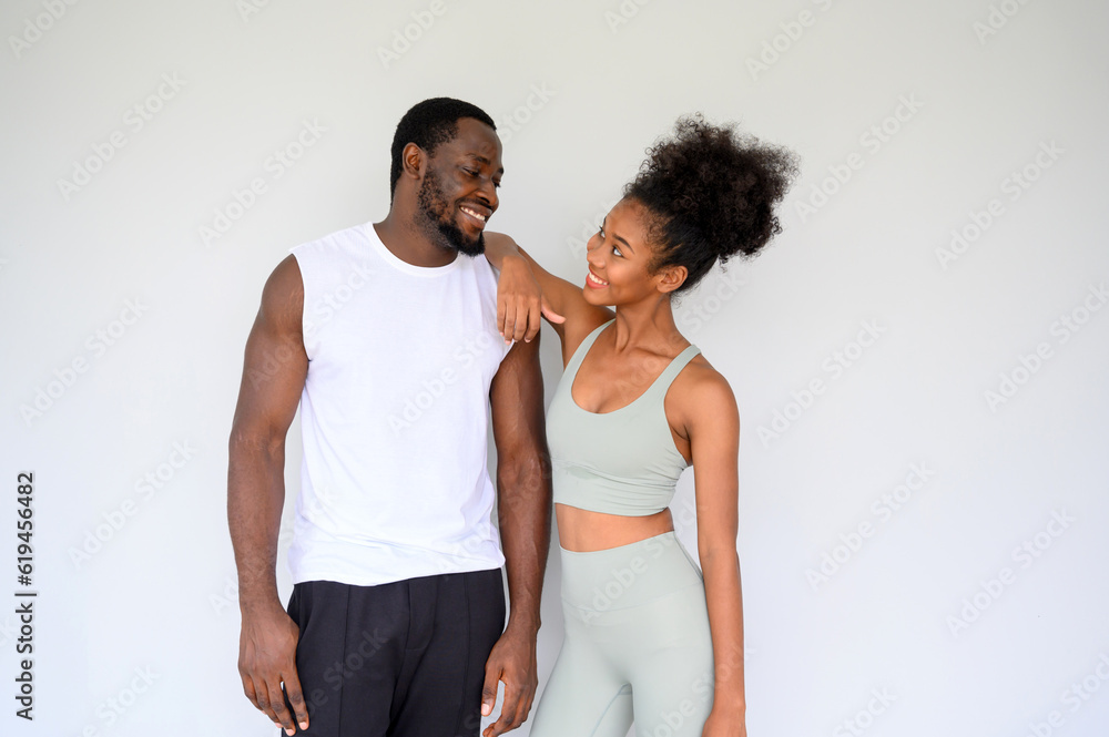 portrait of young couple of African Americans posing in fitness clothes over white background. Healthy and Fitness concept.