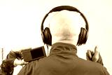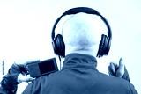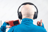 back of the head of a man with headphones in relaxation listening to music on a light background.