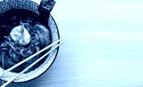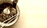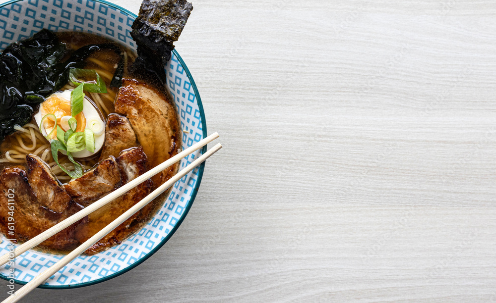 Miso Ramen Asian Noodle Soup. Top view with space for text