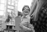 Happy woman realtor shows buyers an apartment in a new high-rise building.