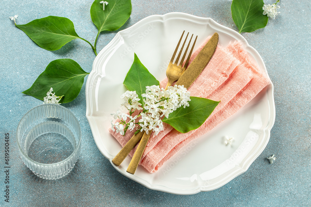 table setting dinner with lilac flower. Summer celebration, wedding greeting card, invitation concept