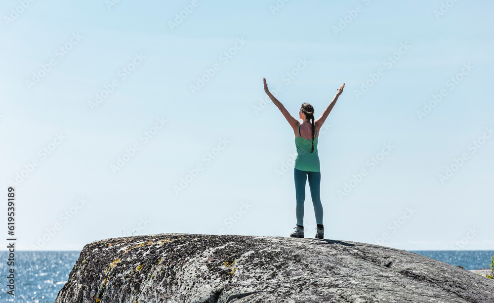 Frau mit ausgebreiteten Armen auf einem Felsgipfel am Meer