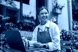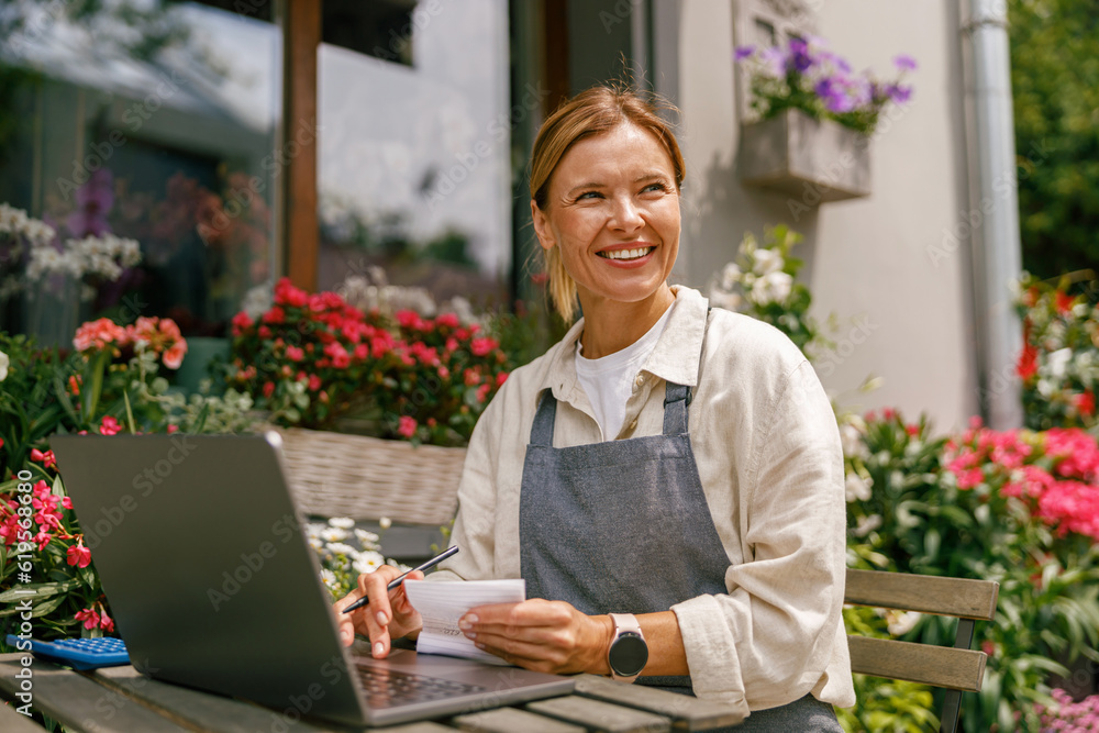 Beautiful flower shop owner wearing apron working on laptop in her store