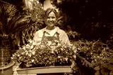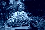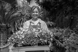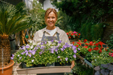 Woman florist small business owner standing in floral store and waiting for client with houseplants
